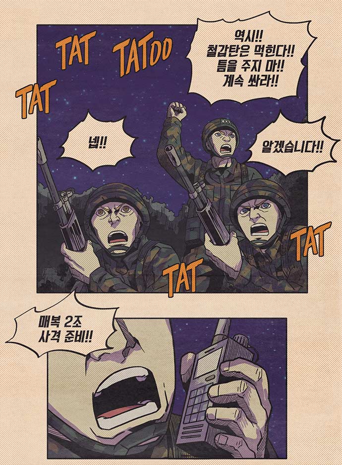 군인1: 한 놈도 남겨두지 말고 모조리 쓸어버려!!